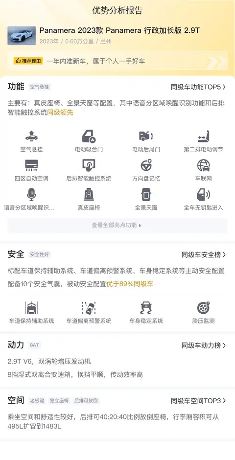 这辆保时捷帕拉梅拉的优势方面,我认为集中在配置,几乎全员满血发挥,无论是车外的电动门 车内的电动调节座椅,再到后排智能触控系统, 科技感豪华感营造的十分到位;缺点方面必然还是保时捷的当家2.9T发动机 ,虽然拥有不错的动力参数,但众所周知保时捷的发动机油液损耗较为严重,尤其是未出保修期就开始有机油消耗大的问题 ,这一点算是这辆帕拉梅拉的潜在雷点吧。