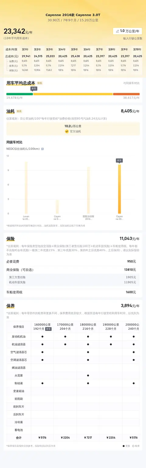 关于用车成本部分,我们估算了一下,从该车8年10个月的车龄去计算,未来三年的平均每年用车成本约23787元,具体的实际费用开销会根据车主的使用情况而有所不同。
