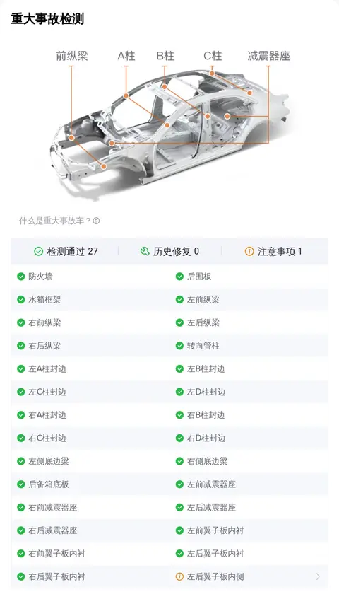 二手车不同于新车,在日常使用中难免会发生一些小意外。比较常见的就是车辆外观覆盖件划伤、剐蹭、划痕、喷漆修复、钣金修复、凹陷、变形等,对于此类小瑕疵,虽然在检测项中会被查出来判定为瑕疵项,但整体并不影响车辆的安全性。总结说一下,如果车辆通过了重大事故、泡水、火烧检测检测,那么说明这辆车的整体车况没有大问题,这个您放心就行。