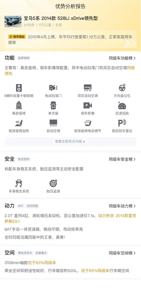 综上所述的新车含税价、用车成本、市场行情、优势分析、同款比价等数据仅供参考。在配置部分,因为二手车非标品,车辆可能会存在配置改装的情况,具体车况信息需要线下结合车辆实际情况进行综合参考。