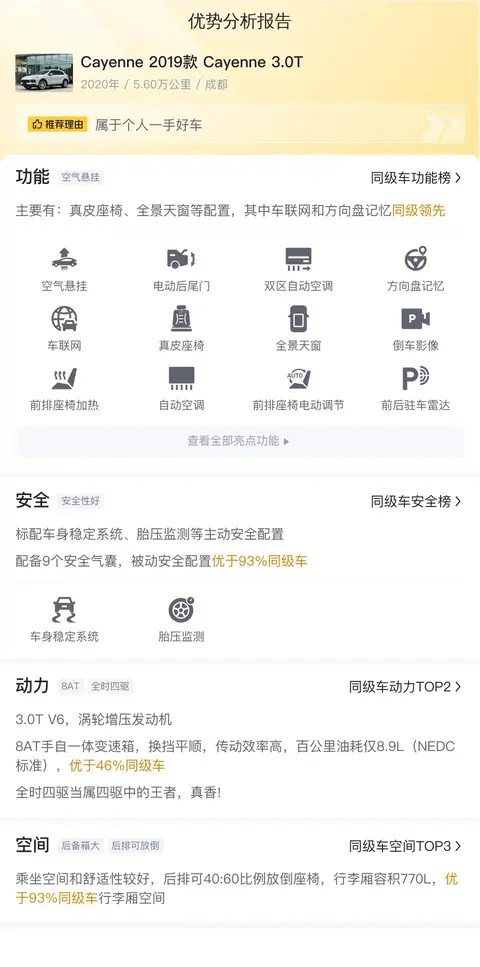 今天介绍的这款是Cayenne 2019款 Cayenne 3.0T,新车含税价为99.87万,而现在的二手车报价是65.30万,相比新车价格,已便宜了34.57万,这车跑了一共5.60万公里,上牌时间是2020年12月,车源地跟上牌地都是成都,过户次数为0次,排放标准为国VI。