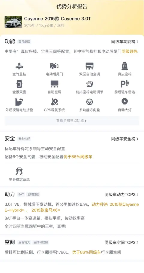 优点:这款Cayenne 2015款 Cayenne 3.0T的知名度不错,保持率高,毕竟是全球车型,而且动力强劲,配置丰富,品质出众,用着省心。