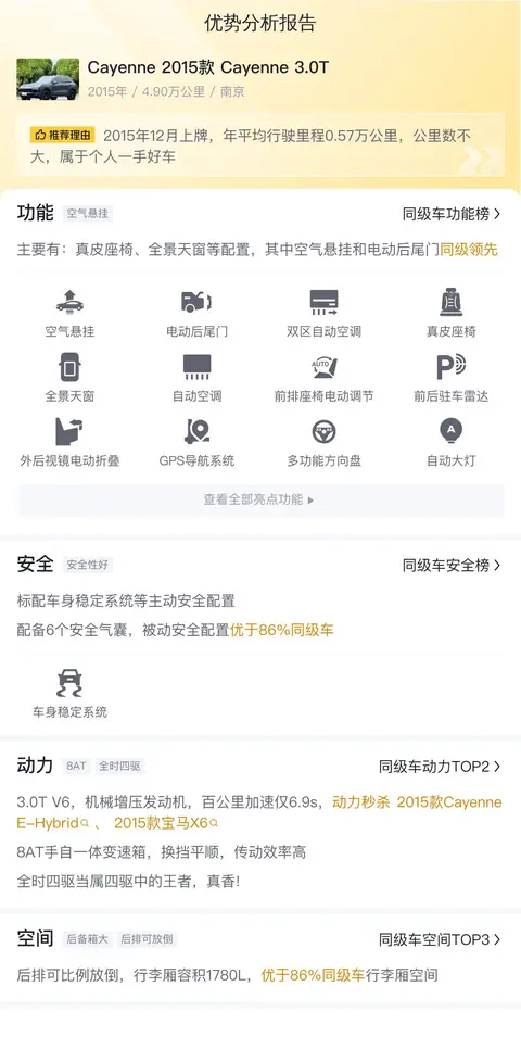优势:卡宴凭借着惊艳的外观、出色的运动能力、优秀的舒适性和安全性以及良好的品牌知名度,都使得它在市场上备受推崇。今天这辆保时捷Cayenne 2015款 Cayenne 3.0T的行驶里程较少,整体的车况也不错,另外,配备的电动后尾门、定速巡航、前排座椅加热、前排座椅电动调节等配置,也能很好满足我们的需求。