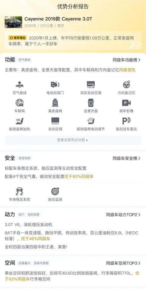 今天我们要为大家介绍的这辆二手保时捷Cayenne是一款2019年款的3.0T版本,属于中大型SUV类别,搭载了3.0T 340马力的V6发动机,配备8挡手自一体变速箱和全时四驱系统,持有真皮座椅与电动后尾门等高级配备,并且符合国VI排放标准。此车于2020年1月在南京地区牌照,至今行驶约5万公里,新车指导价为91.30万元,现二手车报价为60.98万元,车身颜色为蓝色,是一次过户未记录的车辆。