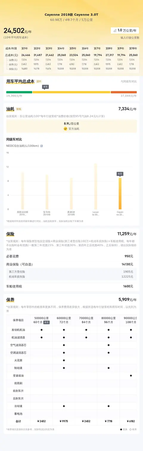 至于用车成本方面,二手保时捷Cayenne的年均综合用车成本大约为2.5万元左右。这一数字涵盖了燃油、保险以及保养等各项费用。然而,实际成本可能会根据车主的使用习惯、行驶里程以及所在地的消费水平等因素有所变动。例如,频繁的高速行驶可能会降低燃油成本,而定期的专业保养则可能会增加一定的支出。因此,潜在买家在评估购车成本时,应考虑到个人的实际情况和预期使用情况,以做出更为合理的预算规划。