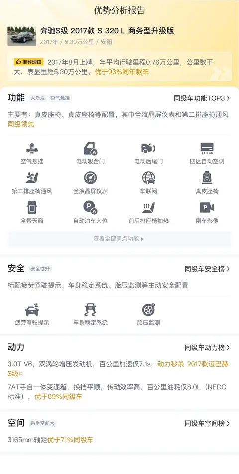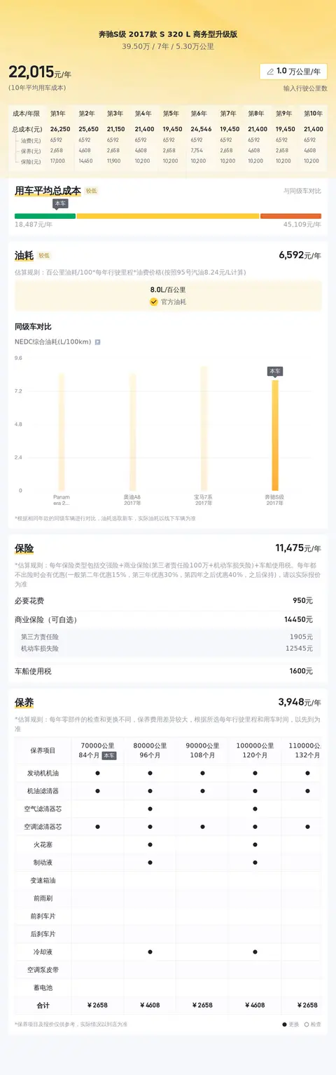 另外,同级车的最低10年平均用车成本是18079元/年,最高是46314元/年,奔驰S级 2017款 S 320 L 商务型升级版是21669元/年,用车成本适中,不占优势。