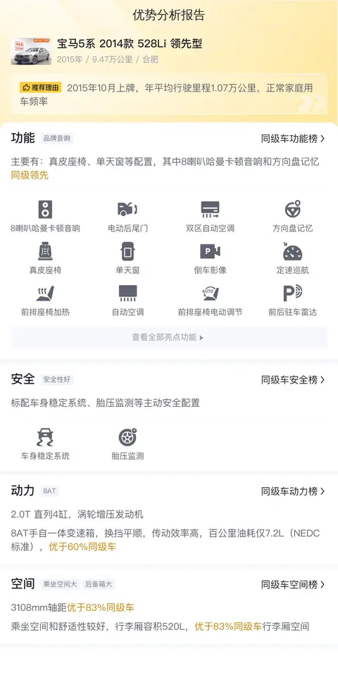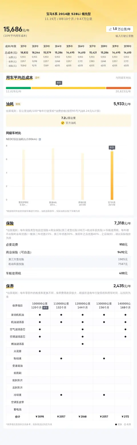 当前市场上,这款宝马5系2014款528Li领先型的二手车价格大约在10万至13万之间。当然,具体的售价还会受到车辆状况等因素的影响。从五年多的平均用车成本来看,该车每年的油费加保险费和保养费约15770元,在同级别车型中处于适中的水平。需要注意的是,由于地区差异、使用强度及保养状况等因素的影响,实际用车成本可能会有所差异。