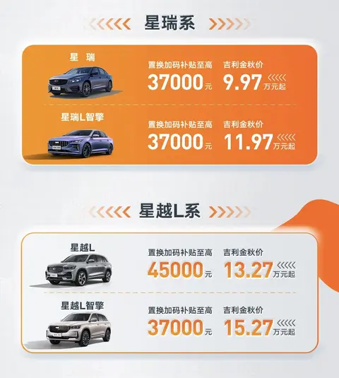 其他车型方面,星瑞和星瑞L智擎的置换补贴至高3.7万元,两款车型优惠后价格分别为9.97万元起和11.97万元起;星越L的置换补贴至高4.5万元,优惠后价格为13.27万元起;星越L智擎的置换补贴至高3.7万元,优惠后价格为15.27万元起。