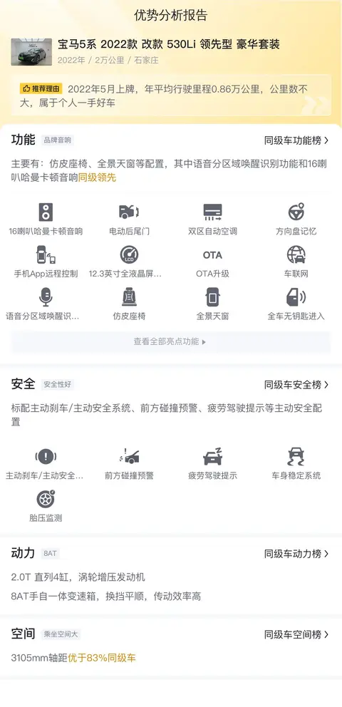 该车具体版本为2022款改款530Li领先型豪华套装,上牌地为石家庄,上牌日期2022年5月,表显里程2万公里,0过户。新车指导价47.19万,目前二手车报价32.37万,相比新车价格便宜14.82万。