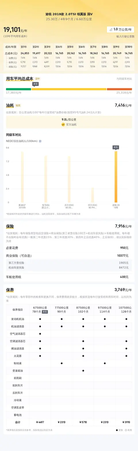 据估算,途锐 2019款 2.0TSI 锐翼版 国V的用车成本较适中,因为它的用车成本是19238元/年,同级车最低用车成本是17460元/年,最高用车成本是26783元/年。