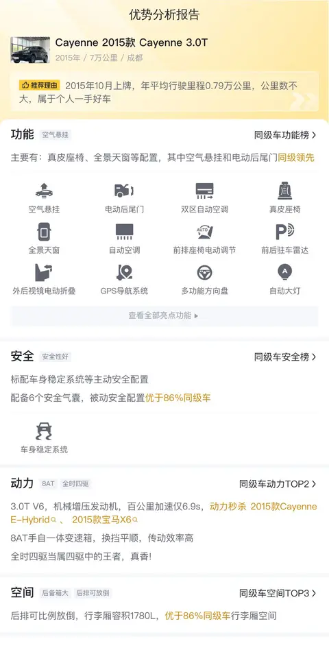 综上所述的新车含税价、用车成本、市场行情、优势分析、同款比价等数据仅供参考。在配置部分,因为二手车非标品,车辆可能会存在配置改装的情况,具体车况信息需要线下结合车辆实际情况进行综合参考。