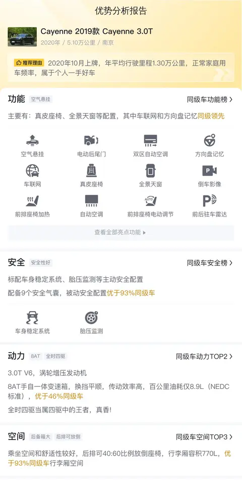 据估算,同级车的最低用车成本是16445元/年,最高是25656元/年,Cayenne 2019款 Cayenne 3.0T是25656元/年,用车成本较高。