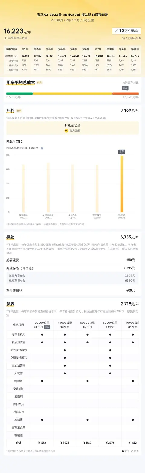 养车成本方面,按照每年2万公里的行驶里程计算,包括保险、保养和其他费用在内,这款宝马X3的年度用车成本大约在33725元左右。具体费用会根据保险政策、保养质量和个人驾驶习惯等因素有所不同。但总体来说,这款车在保养和维护方面的费用还是比较合理的,适合大多数消费者的预算范围。