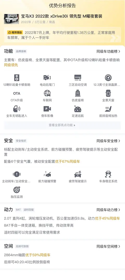 综上所述,宝马X3 2022款 xDrive30i 领先型 M曜夜套装在动力性能、操控性和内饰品质方面表现出色,是一款值得考虑的中型豪华SUV。在购买二手车时,请务必仔细检查车辆的实际状况和历史记录,确保车辆的质量和安全性。希望这篇文章能为您提供有价值的信息,帮助您做出明智的购车决策。