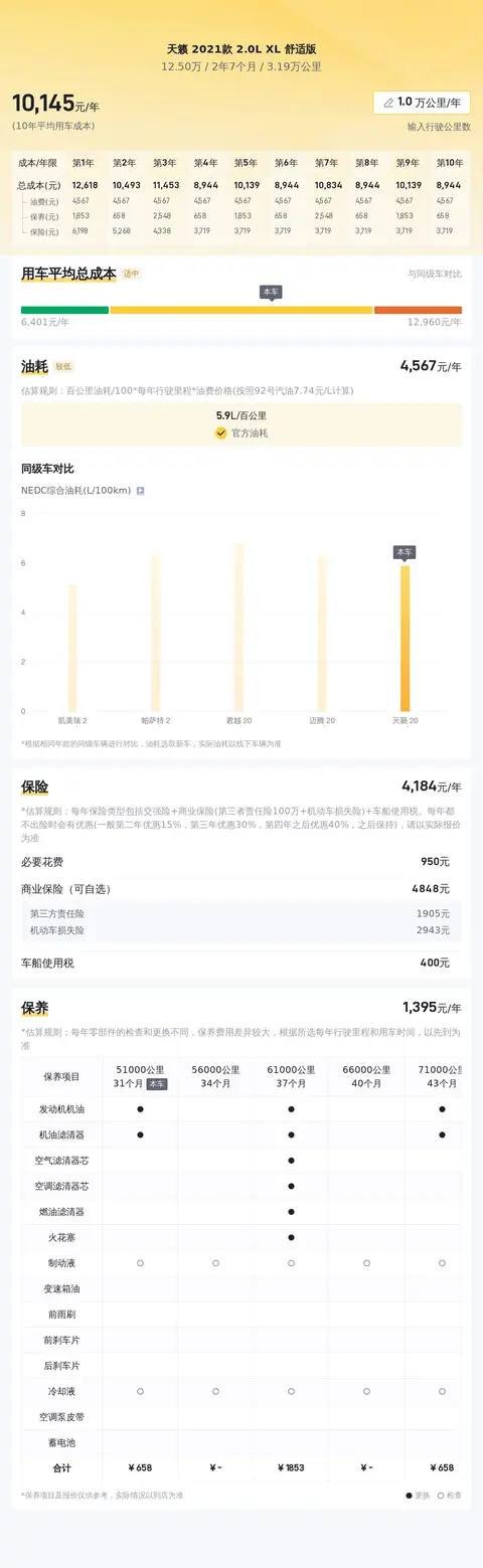 据估算,天籁 2021款 2.0L XL 舒适版的用车成本是10466元/年,同级车最低是6946元/年,最高是13681元/年,所以用车成本较高。