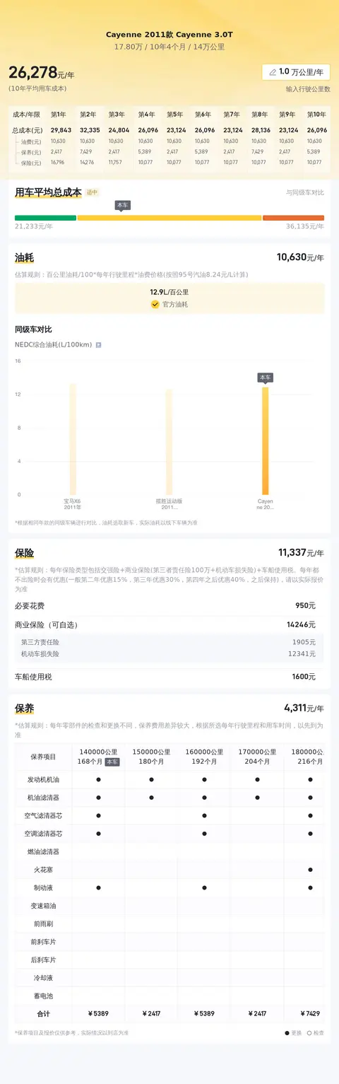 据估算,Cayenne 2011款 Cayenne 3.0T的用车成本是25684元/年,同级车最低是16944元/年,最高是40704元/年,所以用车成本不算低。