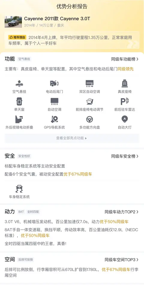 Cayenne 2011款 Cayenne 3.0T,定位是中大型SUV,车身外观颜色为深灰色,内饰是浅色配色。车源地和上牌地都是重庆。2014年4月首次上牌,在此期间过户0次。同时累计行驶里程是14万公里,该车符合国IV排放标准。新车含税价为100.76万,现在的二手车报价是17.80万。