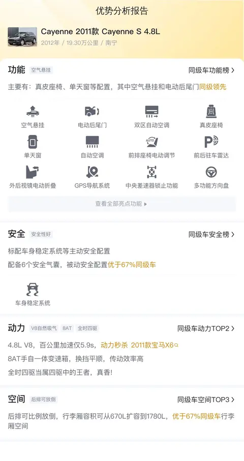 总结:在二手车市场中,每一辆车都有其独特的故事和魅力。而今天介绍的这辆Cayenne 2011款 Cayenne S 4.8L,无疑是一个既豪华又实用的选择。它有着出色的动力性能、豪华的配置以及宽敞的空间,能够满足家庭出行的各种需求。在合理的价格面前,这辆Cayenne无疑是一个值得考虑的选项。但别忘了,二手车市场的水有时深不可测。尽管这辆车在纸面上看起来优秀,但车辆的实际状况才是决定其价值的关键。在做出购买决策之前,一定要亲自查看车辆,进行全面的评估。毕竟,每一辆二手车都是一个神秘的宝藏,只有深入挖掘,才能发现其真正的价值。