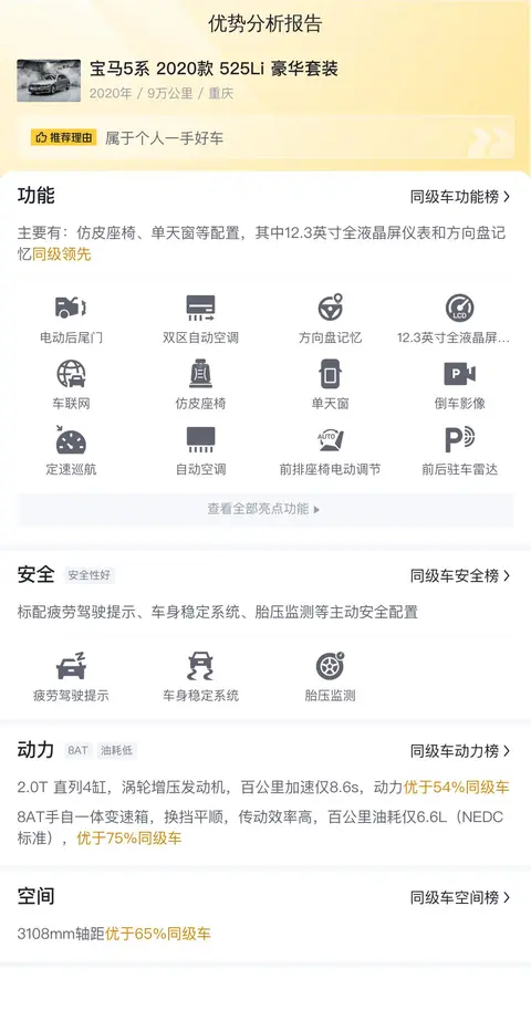这辆宝马5系2020款525Li豪华套装,于2020年7月在重庆上牌,车身颜色为香槟色,目前行驶里程为9万公里,新车指导价为42.69万元,而现在的二手车报价为21.8万元,这是一个相当有吸引力的价格点。