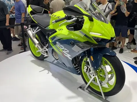 从摩博会现场展车来看,500RR亮点颇多。新车仿赛设计原创度高,前定风翼设计极具战斗激情,,两个前大灯犀利无比。前脸下有硕大的中冷进气格栅,尽显强悍动力。尾灯带有品牌logo个性化设计,车辆尾灯点亮呈“Z”字,与品牌创始人张雪姓氏拼音首位呼应,发动机侧面的“ZXJC”字母标识,让整车充满创始人风格。整车漆水质量上乘,质感很不错。