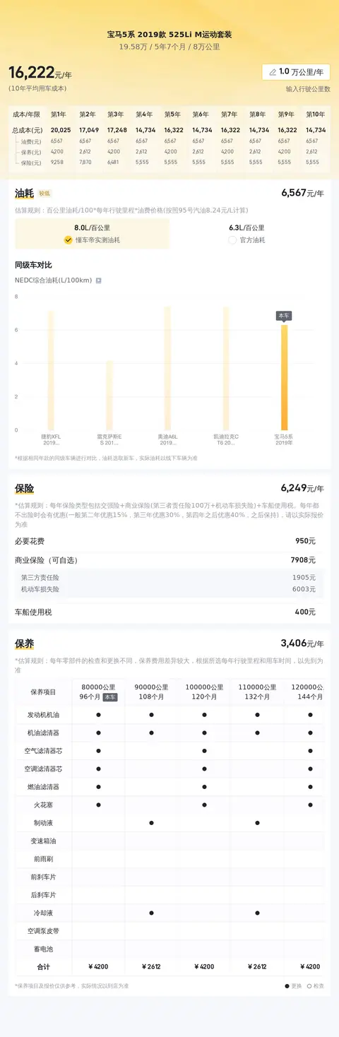 用车成本上,该车官方公布的百公里油耗为6.3L,按每年行驶一万公里里程计算,燃油费用约为5004元,年度商业保险约6185元,每年保养费用约5233元,平均年度用车总成本约16422元,用车成本处于同类型车中等偏下水平。需要注意的是,上述数据仅供参考,实际用车成本受行驶里程、用车环境等多种因素影响而有所不同。