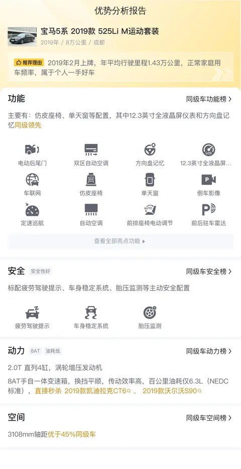 先介绍一下这辆车的基本信息,该车的具体版本是——2019款改款525Li M运动套装。该车定位中大型车,行驶了8万公里,符合国VI排放标准。2019年2月首次上牌,期间过户0次。车源地和上牌地都为成都。该车新车指导价为42.69万,目前二手车报价为19.58万。