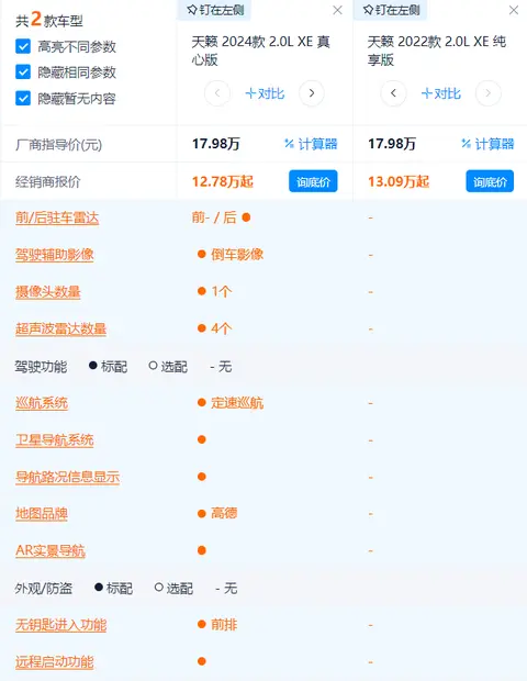 按照价格来看,天籁真心版属于整个车系的门槛版本,比它高一级的版本,是2022款2.0L XE 纯享版,在网上可查到的终端售价在13.09万元。那么这两款车有哪些配置上的差别呢?今天我们就来分析一番。
