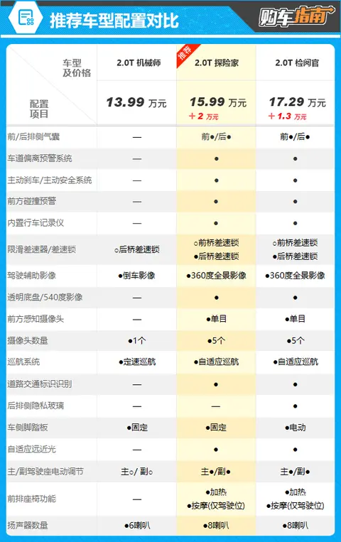 本次推荐的是售价为15.99万元的2.0T 探险家,通过配置对比可以看出,推荐车型相比入门版车型,增加了车道偏离预警系统、前方碰撞预警、透明底盘/540度影像、前排座椅加热、按摩(驾驶位)等功能,可有效提升日常用车的安全性和舒适性。此外,摄像头数量升级为5个、倒车影像升级为360度全景影像。而售价仅比2.0T 机械师多出2万元,绝对物超所值,性价比出色。
