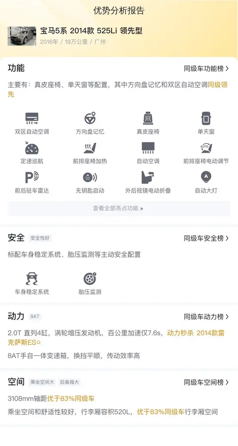 今天给大家介绍的这款宝马5系2014款525Li领先型来自广东广州,上牌日期为2016年2月,表显里程19万公里,香槟色车身深色内饰,过户次数1次。新车指导价46.66万,二手车报价12.38万包含过户费。