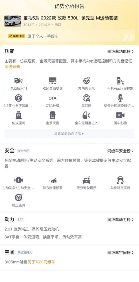 先介绍一下这辆车的基本信息,该车的具体版本是——宝马5系 2022款 改款 530Li 领先型 M运动套装。定位中大型轿车,车身外观颜色为白色,内饰是深色配色。车源地和上牌地都是海口。2022年7月首次上牌,在此期间过户0次。同时至今累计行驶里程是5万公里,该车符合国VI排放标准。新车含税指导价为51.35万,而现在的二手车报价是33.98万,中间相差17.37万。