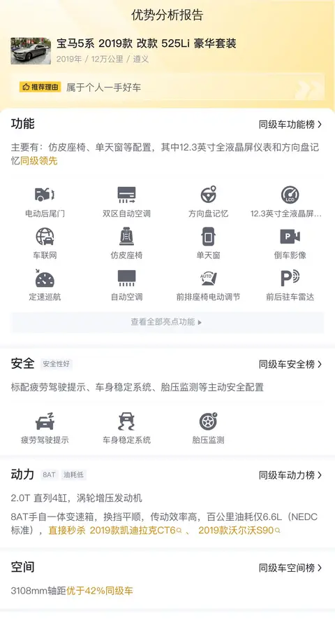综合以上信息,这台宝马5系 2019款 改款 525Li 豪华套装虽然是一辆二手车,但其配置、性能和空间等方面的表现都不错,适合家庭使用或者商务接待。然而,作为消费者,在购买二手车时需要谨慎对待,建议选择信誉好的商家或者熟人介绍的车辆,并且要仔细检查车辆的保养和维修情况,以及是否存在事故历史或者泡水等问题。同时,考虑到豪车后期的维修保养成本可能会较高,需要将这一因素纳入购车预算之中。