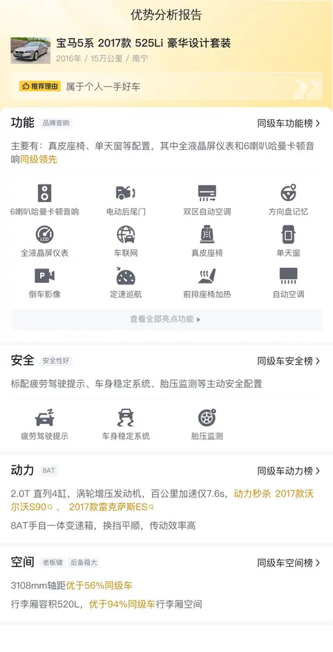 先让我们来了解一下这辆二手宝马5系的基本情况。该车具体版本为——宝马5系 2017款 525Li 豪华设计套装。该车定位中大型轿车,车身外观颜色为香槟色,内饰则是深色配色。车源地和上牌地都在南宁。该车在2016年10月上牌,至今行驶里程约为15万公里,符合国V排放标准,有0次过户记录,是一手车。新车指导价为49.96万元,而现在的二手车报价为12.68万元,相较新车指导价便宜了37.28万元。