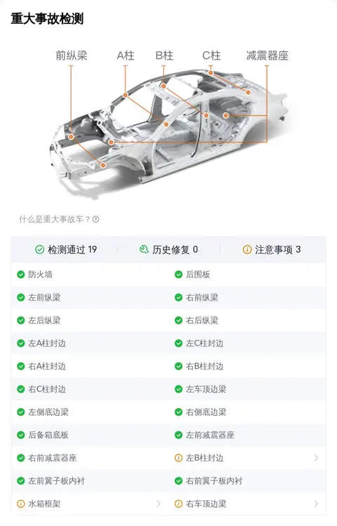 二手车不同于新车,在日常使用中难免会发生一些小意外。比较常见的就是车辆外观覆盖件划伤、剐蹭、划痕、喷漆修复、钣金修复、凹陷、变形等,对于此类小瑕疵,虽然在检测项中会被查出来判定为瑕疵项,但整体并不影响车辆的安全性。总结说一下,如果车辆通过了重大事故、泡水、火烧检测检测,那么说明这辆车的整体车况没有大问题,这个您放心就行。