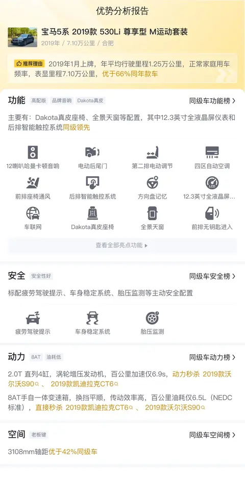总结:综上所述,这款二手宝马5系 2019款 530Li 尊享型 M运动套装在市场上的表现可谓亮点纷呈,但也存在一些不足之处。首先,从积极的方面来看,这款车型凭借其卓越的性能、豪华的配置以及合理的性价比,成为了许多消费者的首选。其次,该车作为一款二手车,价格相较于新车更为优惠,对于预算有限的消费者来说,无疑是一个不错的选择。然而,作为一款豪华轿车,该车的后期维护成本相对较高,这对于一些预算有限的消费者来说可能是一个负担。而且,由于车辆已经行驶了一定的里程数且有过一次过户,潜在的保养问题也需要更多关注。尽管如此,该车依旧凭借着其出色的表现和合理的价格,在二手车市场上占据了一席之地。