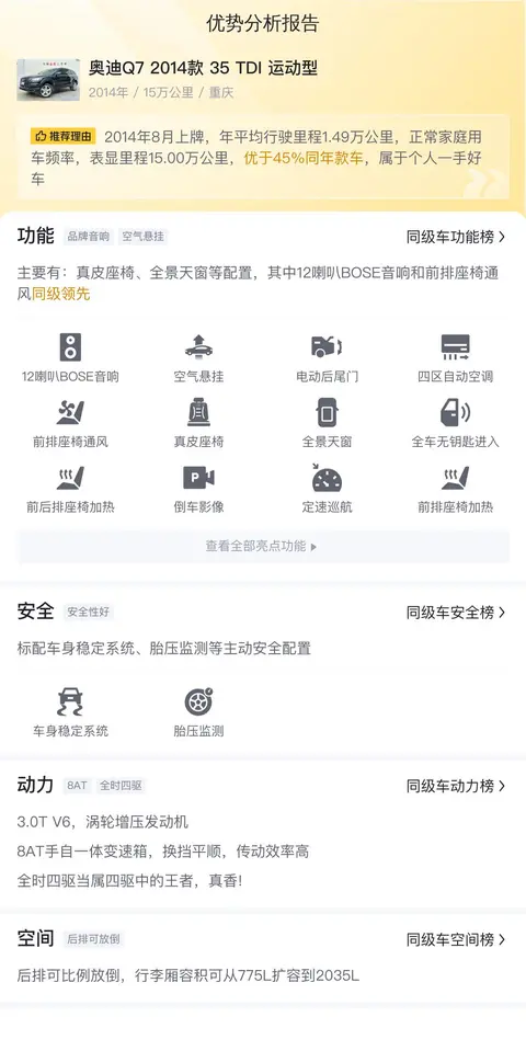 综合来看,这辆奥迪Q7 2014款 35 TDI 运动型适合那些远郊自驾游为主的车友,拖着两吨重的房车甚至摩托艇去享受生活的老Q7车主大有人在,强大的柴油扭矩就是底气。当然,也有不少车友喜欢第一代Q7这种浑厚的车身造型,这个见仁见智了。