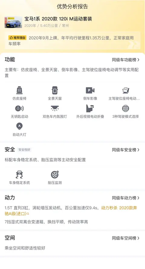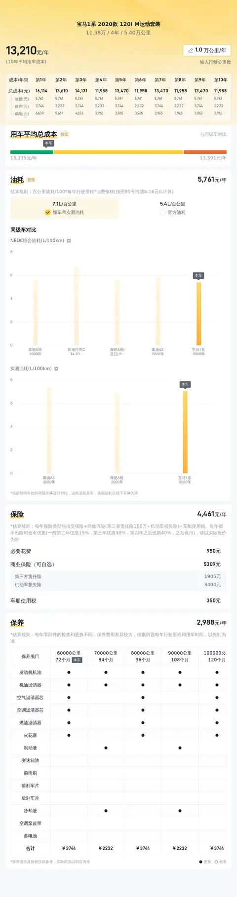 据估算,同级车的最低用车成本是4645元/年,最高是13988元/年,宝马1系 2020款 120i M运动套装是12677元/年,所以用车成本较高。