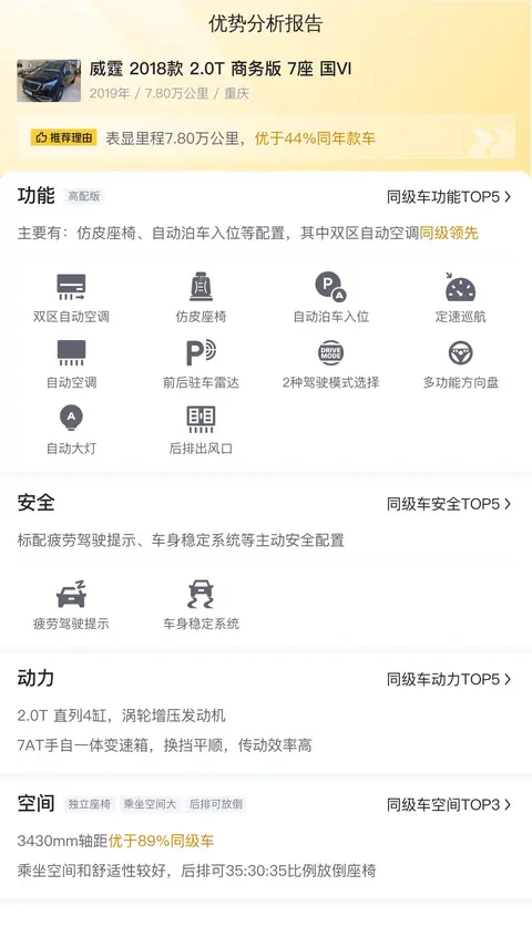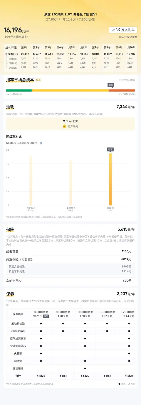 据估算,同级车的最低用车成本是13952元/年,最高是18046元/年,奔驰威霆 2018款 2.0T 商务版 7座 国VI是16081元/年,用车成本适中。