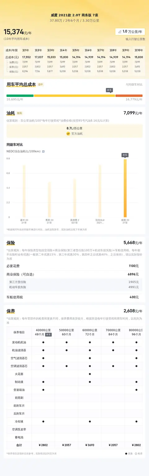 综上所述的新车含税价、用车成本、市场行情、优势分析、同款比价等数据仅供参考。在配置部分,因为二手车非标品,车辆可能会存在配置改装的情况,具体车况信息需要线下结合车辆实际情况进行综合参考。