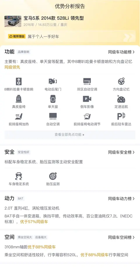优点是作为豪华品牌的宝马,本身品质要求会更高一些,再加上这辆宝马5系在试驾过程中,不管是隔音、滤震、舒适性,还是操控性,都还不错。另外,整车的配置也比较丰富,配备了电动调节座椅、全景天窗、前后雷达+倒车影像等非常实用的配置。并且这辆车的发动机和变速箱均为原厂状态,没有进行过拆卸和维修,值得放心。