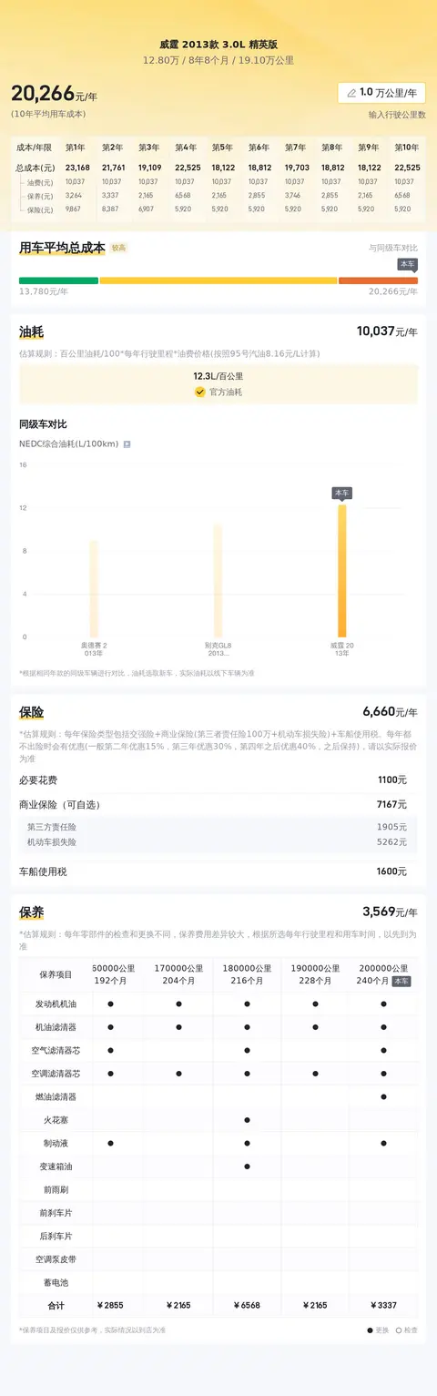 关于二手车市场行情,我们暂且把目光放到一边,先来看看这台二手奔驰威霆的用车成本。根据相关数据统计显示,这台车的十年平均用车成本约为20507元/年,乍一看好像没什么,但细想一下,两万多块钱对于很多家庭来说并非是一笔小数目,不过话又说回来了,愿意花十几万甚至几十万买一台汽车的人,估计也不会太在乎这么点“油钱”。