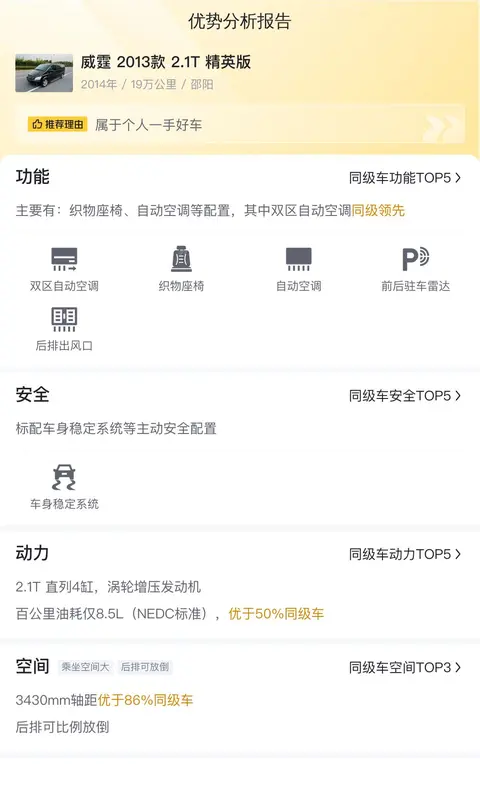 综上所述的新车含税价、用车成本、市场行情、优势分析、同款比价等数据仅供参考。在配置部分,因为二手车非标品,车辆可能会存在配置改装的情况,具体车况信息需要线下结合车辆实际情况进行综合参考。