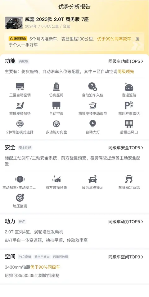 据估算,同级车的最低用车成本是11709元/年,最高是16920元/年,威霆 2023款 2.0T 商务版 7座是13135元/年,用车成本适中。