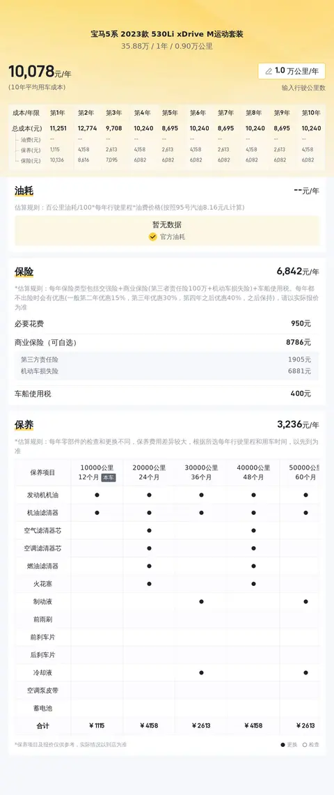 在用车成本方面,根据懂车帝对这款车的大数据分析,从图片上我们可以看到,这款宝马5系的10年平均用车成本约是16181元/年,可供您参考。