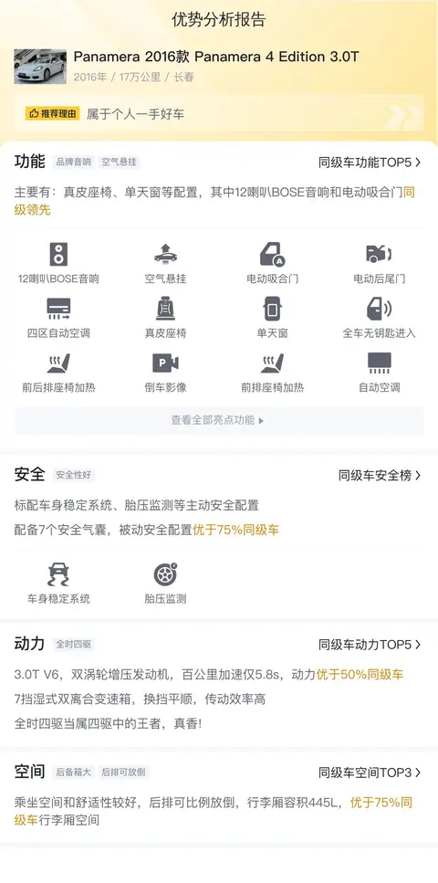 这辆Panamera 2016款 Panamera 4 Edition 3.0T,新车含税价为140.90万,现在的二手车报价是28.50万,这样的价格,确实很让人心动,毕竟保时捷的气质和品质摆在这,另外,该车行驶里程17万公里,不到10年使用时间,整体成色还是很新的,3.0T V6双涡轮增压发动机也能保证强劲的动力输出。不过这种豪车保养费用比较高,还应该谨慎试驾,综合考虑。