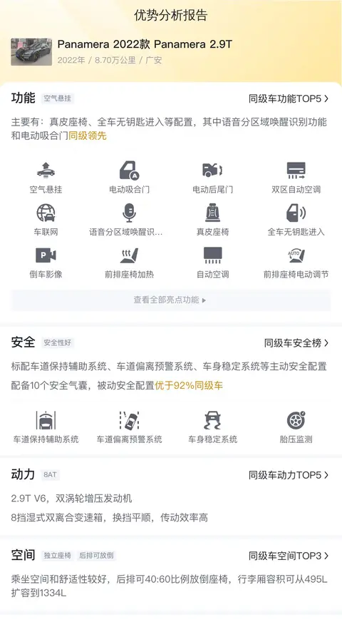 缺点:豪车之所以是豪车,不仅仅是因为售价,还有后期的养护成本,比如这辆Panamera 2022款 Panamera 2.9T,据估算,Panamera 2022款 Panamera 2.9T的用车成本是4601元/年,看着不多,但对比一些新能源车型,还是要高不少,另外就是考虑到Panamera 2022款 Panamera 2.9T已经跑了8.70万公里,这个公里数有点大,会缩短车子的寿命,增加故障的发生概率。最后就是Panamera 2022款 Panamera 2.9T两年多的时间,有27.42万的差价,贬值率还是高的,需要谨慎评估。