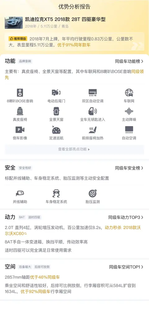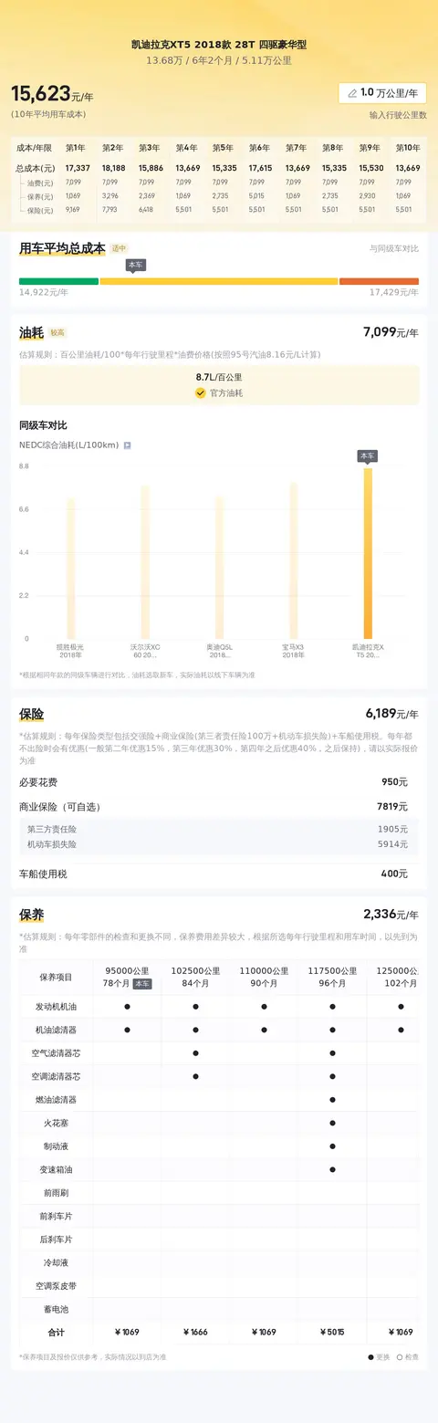 据估算,同级车的最低用车成本是13102元/年,最高是18346元/年,凯迪拉克XT5 2018款 28T 四驱豪华型是15700元/年,用车成本适中。