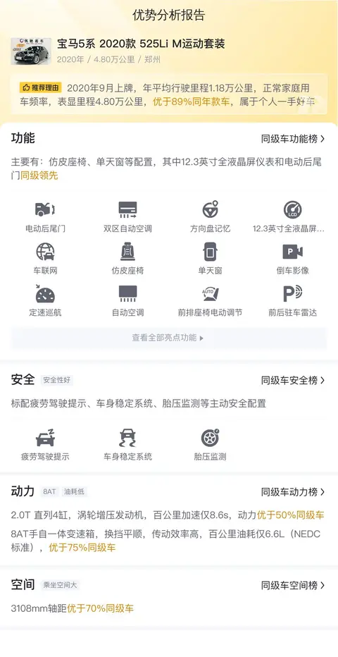 综上所述的新车含税价、用车成本、市场行情、优势分析、同款比价等数据仅供参考。在配置部分,因为二手车非标品,车辆可能会存在配置改装的情况,具体车况信息需要线下结合车辆实际情况进行综合参考。