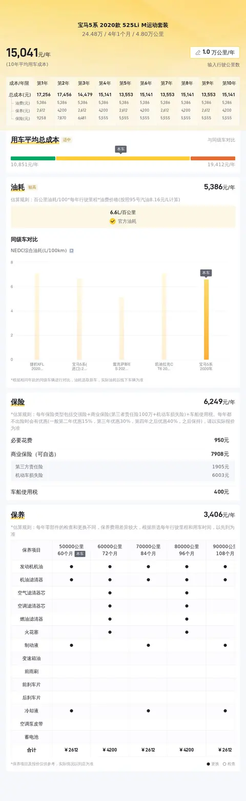 据估算,宝马5系 2020款 525Li M运动套装的用车成本较低,因为同级车的最低用车成本是14458元/年,最高是17766元/年,而宝马5系 2020款 525Li M运动套装是15188元/年。