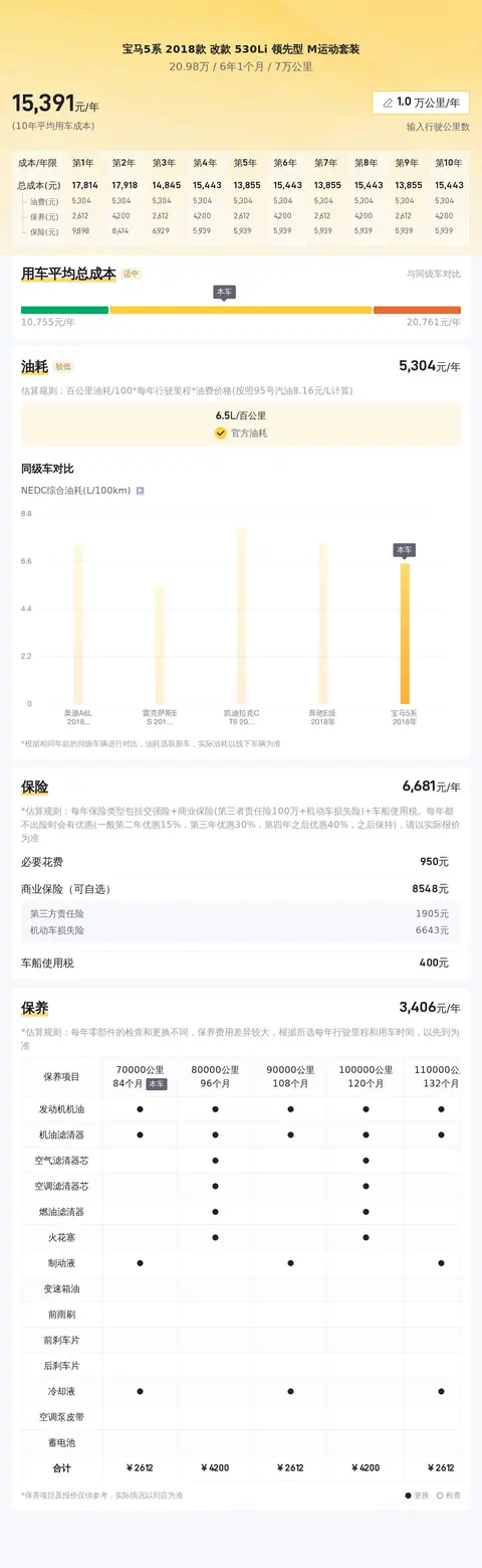 在市场行情部分,当前这款宝马5系的二手车行情在18万至22万左右,这辆车的报价20.98万,整体来说价格合理,在正常的波动范围内,不过还是有点偏高的,毕竟这辆车已经跑了7万公里了。在用车成本上,这辆车的年均综合用车成本约1.5万元左右,从用车经济性角度考虑,这辆车还是比较合适的。