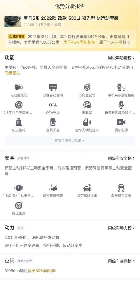 综上所述的新车含税价、用车成本、市场行情、优势分析、同款比价等数据仅供参考。在配置部分,因为二手车非标品,车辆可能会存在配置改装的情况,具体车况信息需要线下结合车辆实际情况进行综合参考。